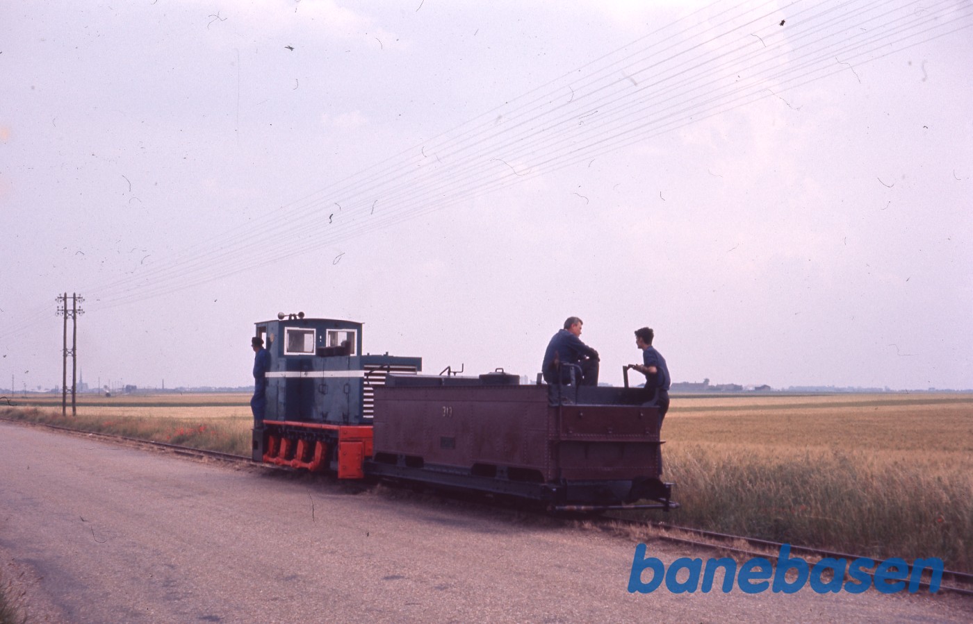 Motiv:Motorlokomotiv og specialvogn kører langs vejen og marken