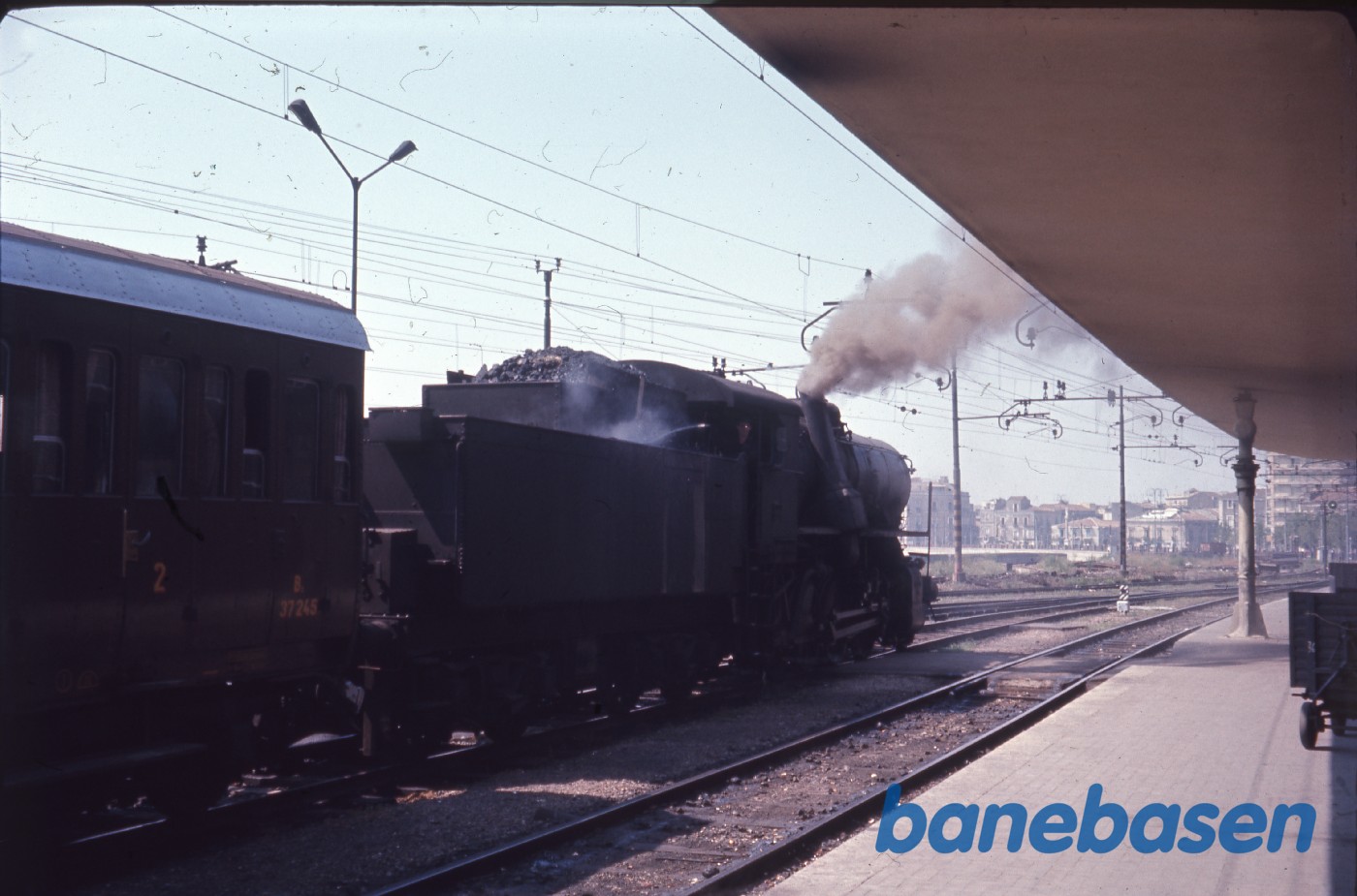 Motiv:Damplokomotiv på stationen med Franco-Crosti kedel. Læg mærke til det specielle skorstensarrangement