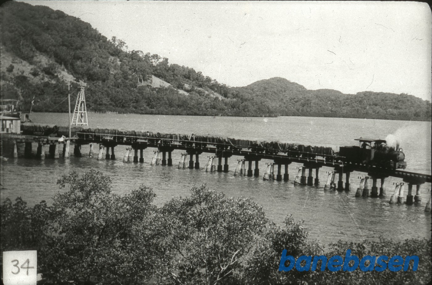Motiv:Et godstog holder på en bro ude i søen, formentlig en omlastningsplads