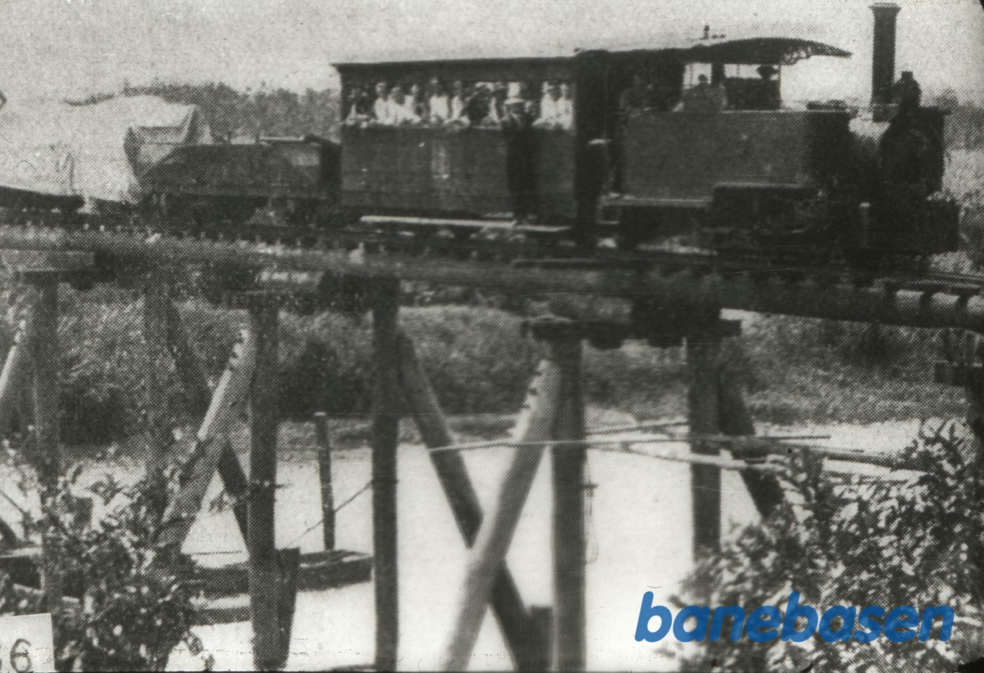 Et damptog med en passagervogn og mange godsvogne på en bro. Ligner affotografering fra en avis eller bog