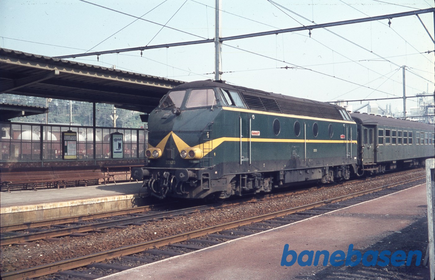 Motiv:Diesellokomotiv med persontog på station