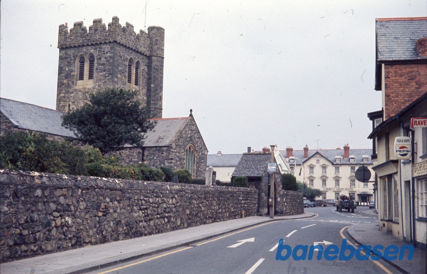 Gadebillede med kirken til venstre og torvet for enden af gaden