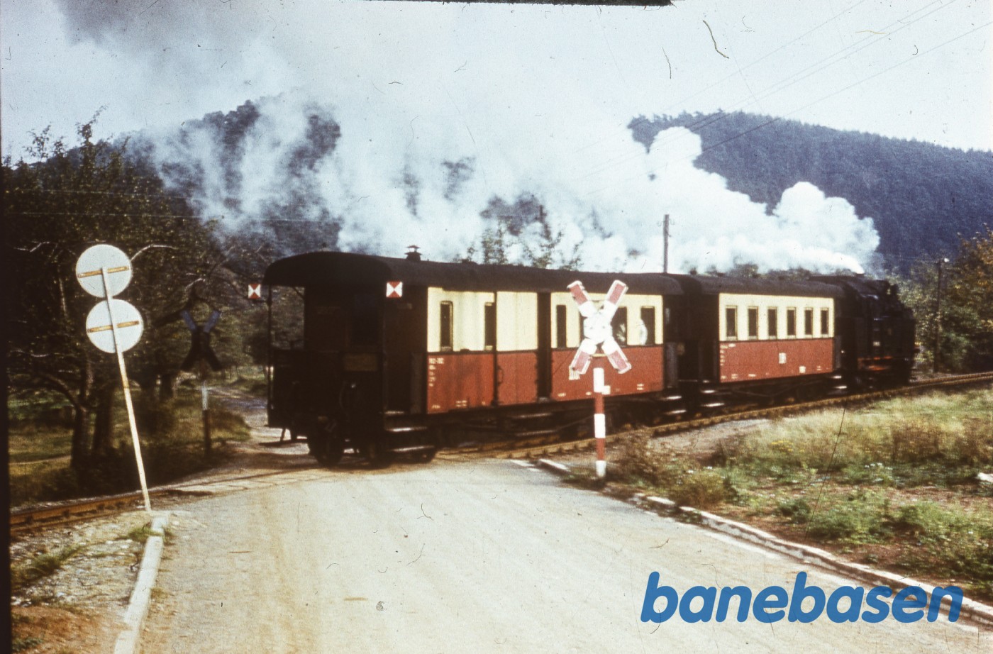 Motiv:Damptoget krydser en lille vej i udkanten af byen