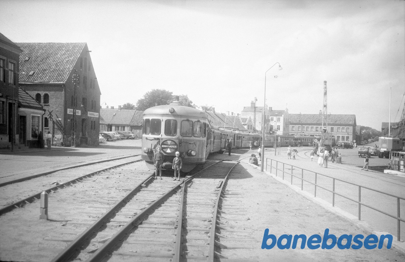 Motiv:Bornholmspilen bestående af 8 skinnebusser i Simrishamn.