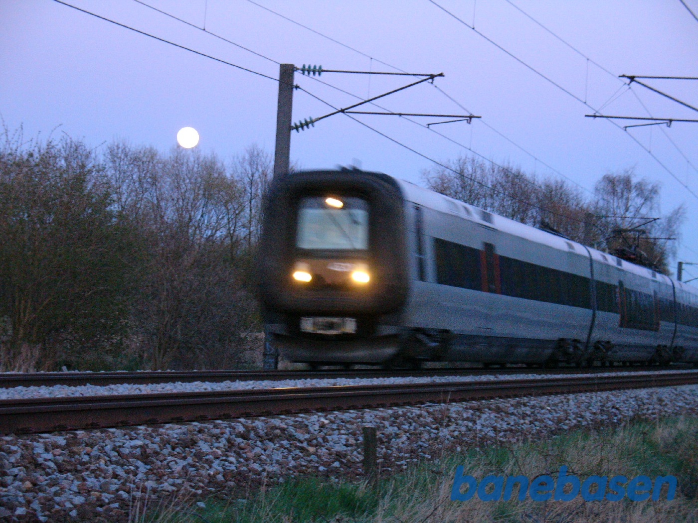 Øresundstog på Kystbanen og fuldmånen lige over trækronerne