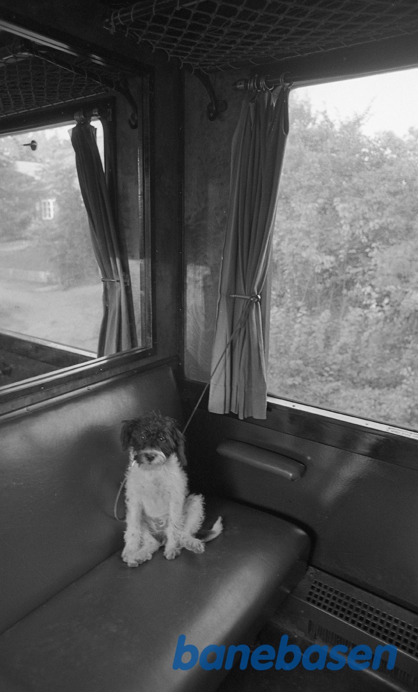 Motiv:Hund på sæde i C216 mens Niels Chr kigger på.
