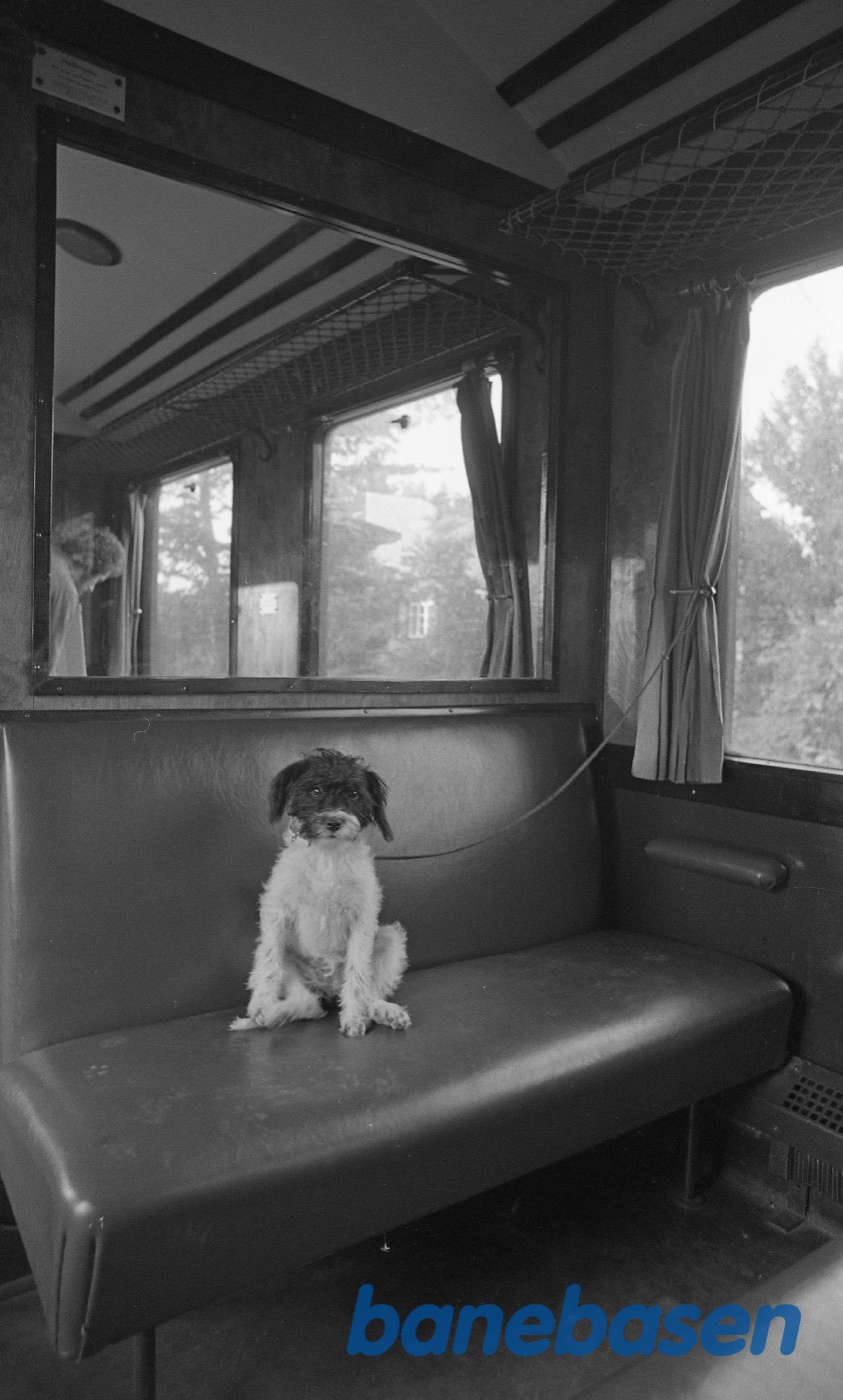 Motiv:Hund på sæde i C216 mens Niels Chr kigger på.