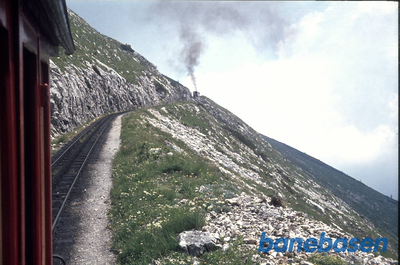 Østrig - Smalsporsbaner. Tog på vej op mellem Schafbergalpe og Schafbergspitze