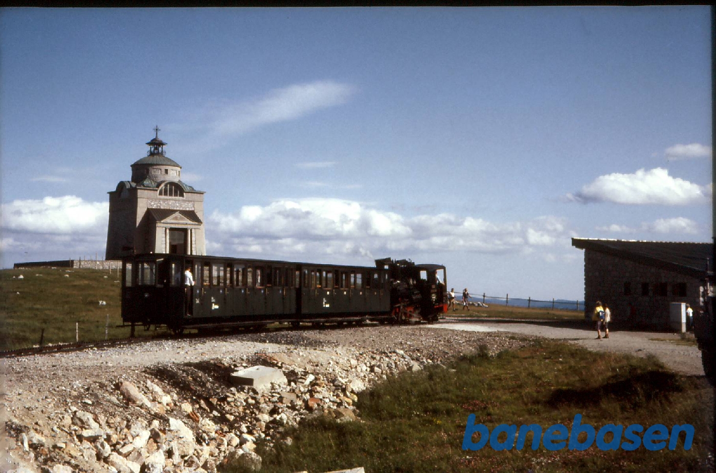 Østrig - Smalsporsbaner. Tog på Hochschneeberg station med Elisabethkirche i baggrunden