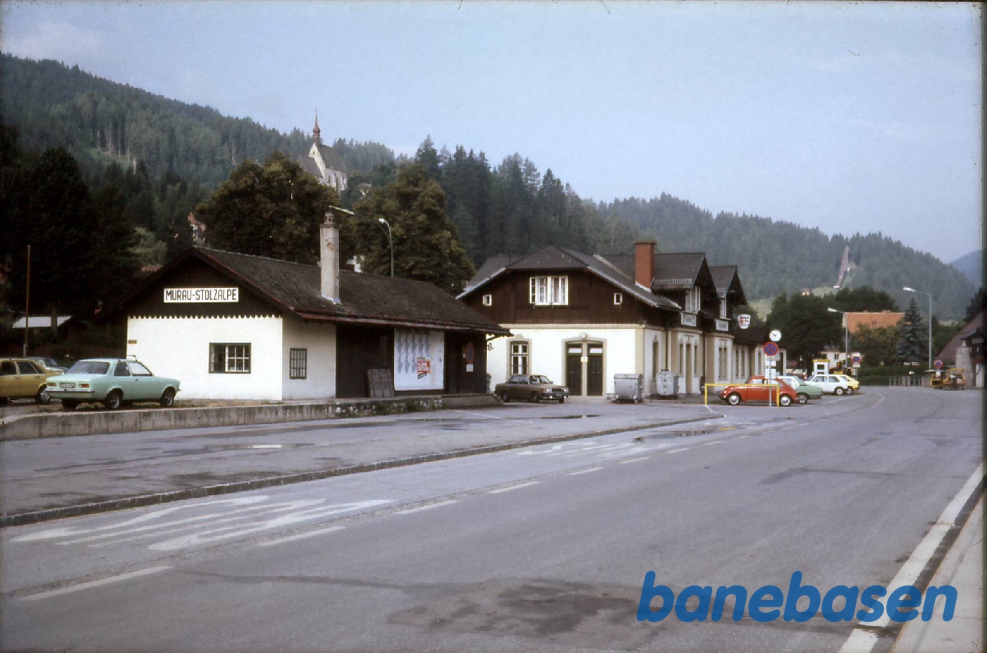 Østrig - Smalsporsbaner. Murau station set fra gaden