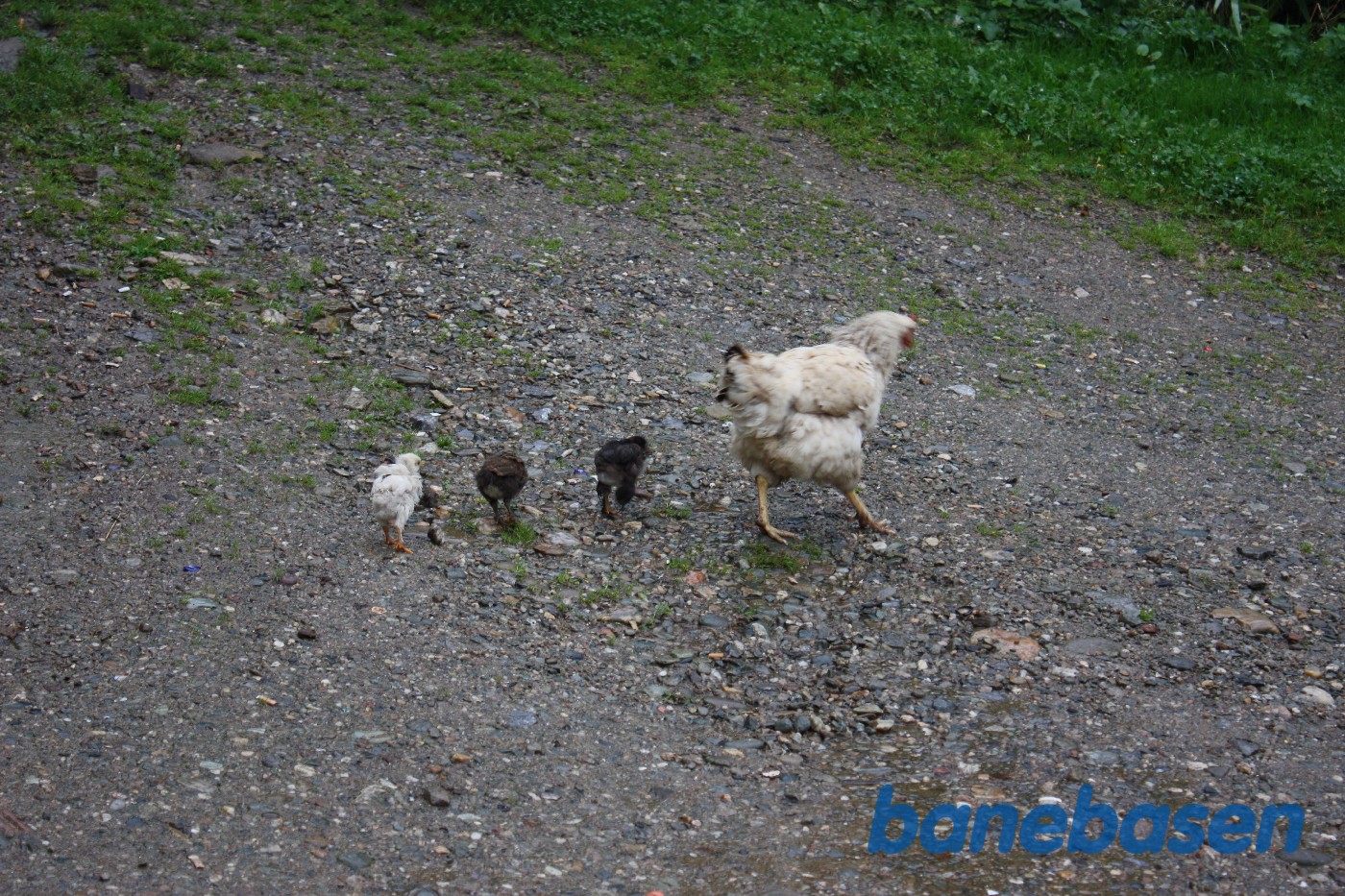 Motiv:Høne med kyllinger ved et nærliggende udsalg og cafe