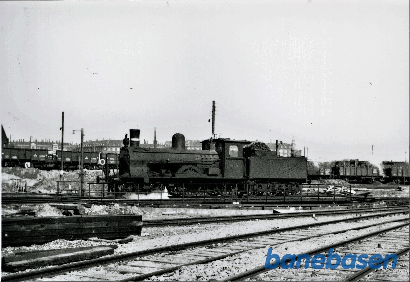 | Motiv: | Damplokomotiv ltr C nr 718 foran maskindepotet på kbh GB |