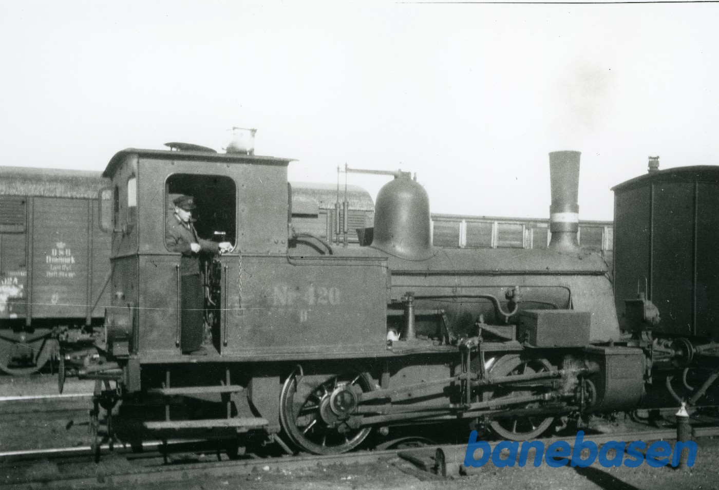 Damplokomotiv DSB HS 420 rangerer i ?.I baggruden står DSB godsvogn HD 38024