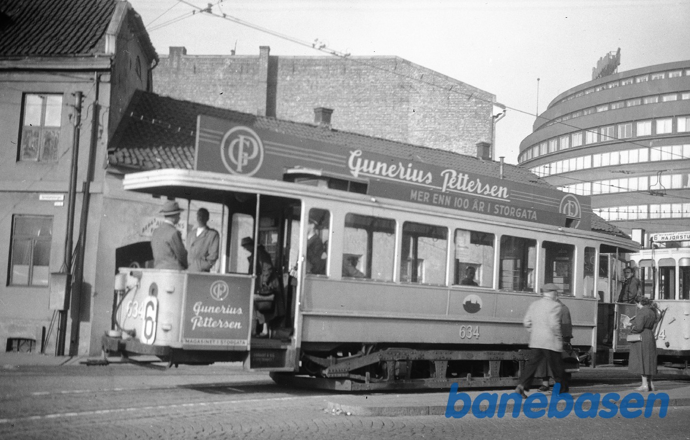 Yderligere beskrivelse:Bildet er tatt ved holdeplassen Jernbanetorget. I bakgrunnen sees Dronningens gate, som huser RUTER, som er administrasjonsselskap for Kollektivtrafikken i Osloområdet. Bivogn 634 ble levert av HaWa og satt i trafikk 8.2.1924. Den var i trafikk til 29.10.1967 og ble senere overtatt av Lokaltrafikkhistorisk Forening. Den befinner seg i dag Vognhall 5 på Majorstuen, som inneholder Sporveismuseet i Oslo. Motorvognen som trekker 634 er 124. Den ble levert av verkstedet til Kristiania Sporveisselskab i Homansbyen og satt i drift 7.3.1923 som 508. Kupeen kommer fra en eldre vogn levert av Busch til Kristiania Kommunale Sporveie i 1899, overtatt av Kristiania Sporveisselskab i 1905. Vognen fikk nummer 124 hos Oslo Sporveier. Den var i trafikk til 29.10.1967 og ble opphugget 16.12.1968