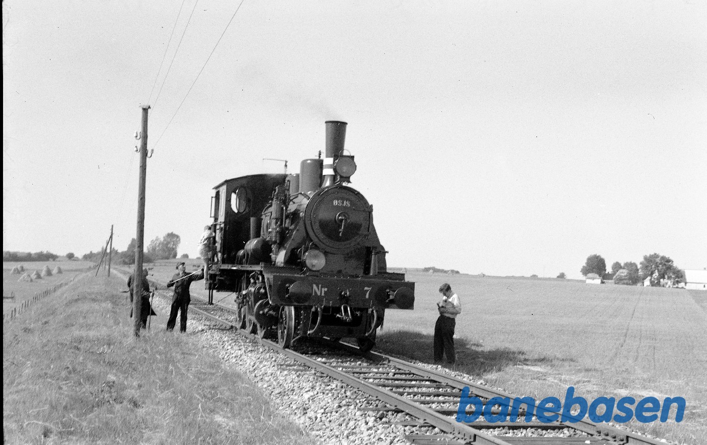 Motiv:Damplokomotiv nr. 7, ophold på fri strækning under prøvetur