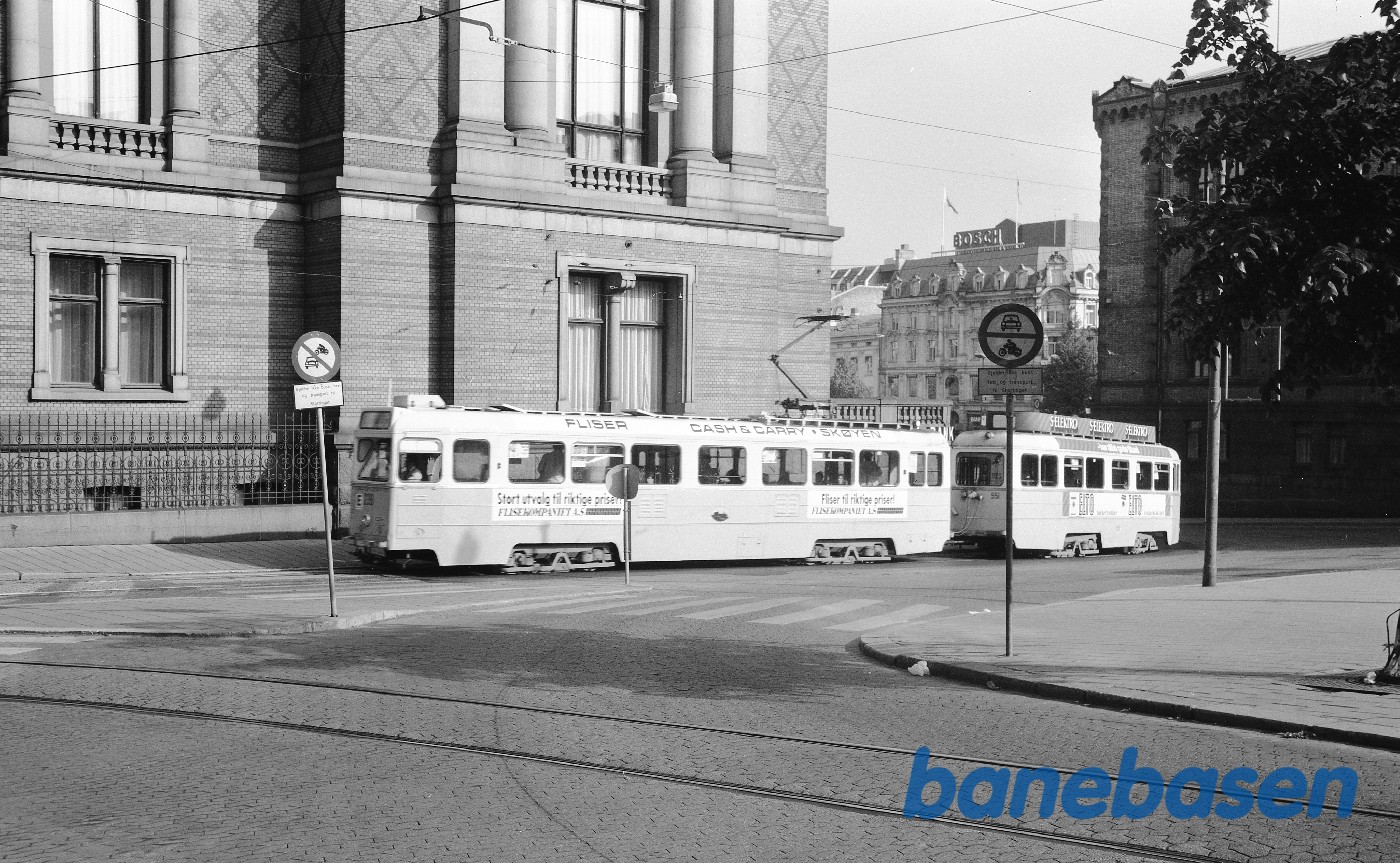 Yderligere beskrivelse:Bildet er tatt på Wessels plass. Sporvognstoget er i ferd med å svinge fra Stortingsgaten og inn i Nedre Vollgate. Bygningen i bakgrunnen til venstre er Frimurerlosjen og til høyre sees litt av Stortinget. Materiellet er levert av Høka/Hägglund i årene 1952-58. 50 motorvogner 204-253 og 30 bivogner 551-580 (563-580 hadde vognkassser fra Strømmens Værksted). Materiellet ble utrangert i årene 1993-1997