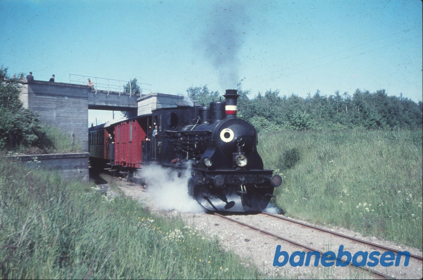Damplokomotiv nr. 3 med udflugtstog for DJK ved broen for Fugleflugtslinien, nord for Flintinge