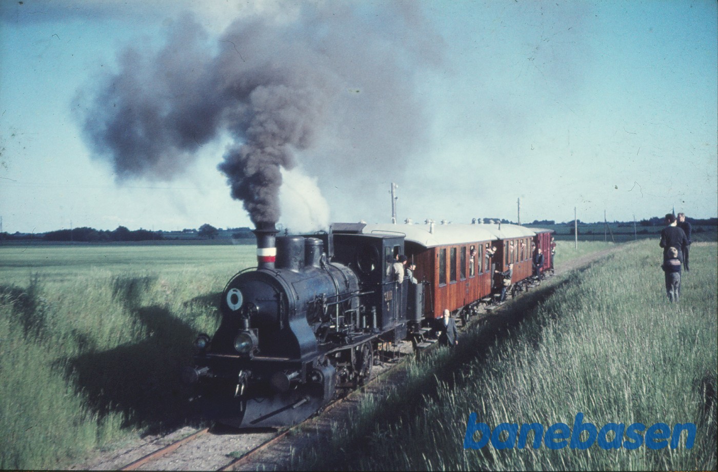 Motiv:Damplokomotiv nr. 3 med udflugtstog for DJK på fri strækning ved Nysted