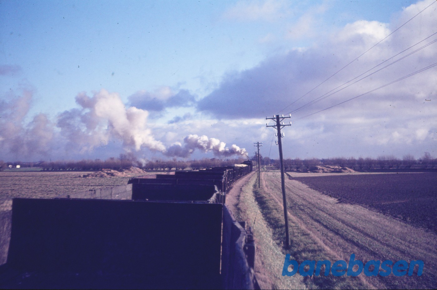 Motiv:Damplokomotiv nr. 14 med godstog på fri strækning, set fra togførervognen