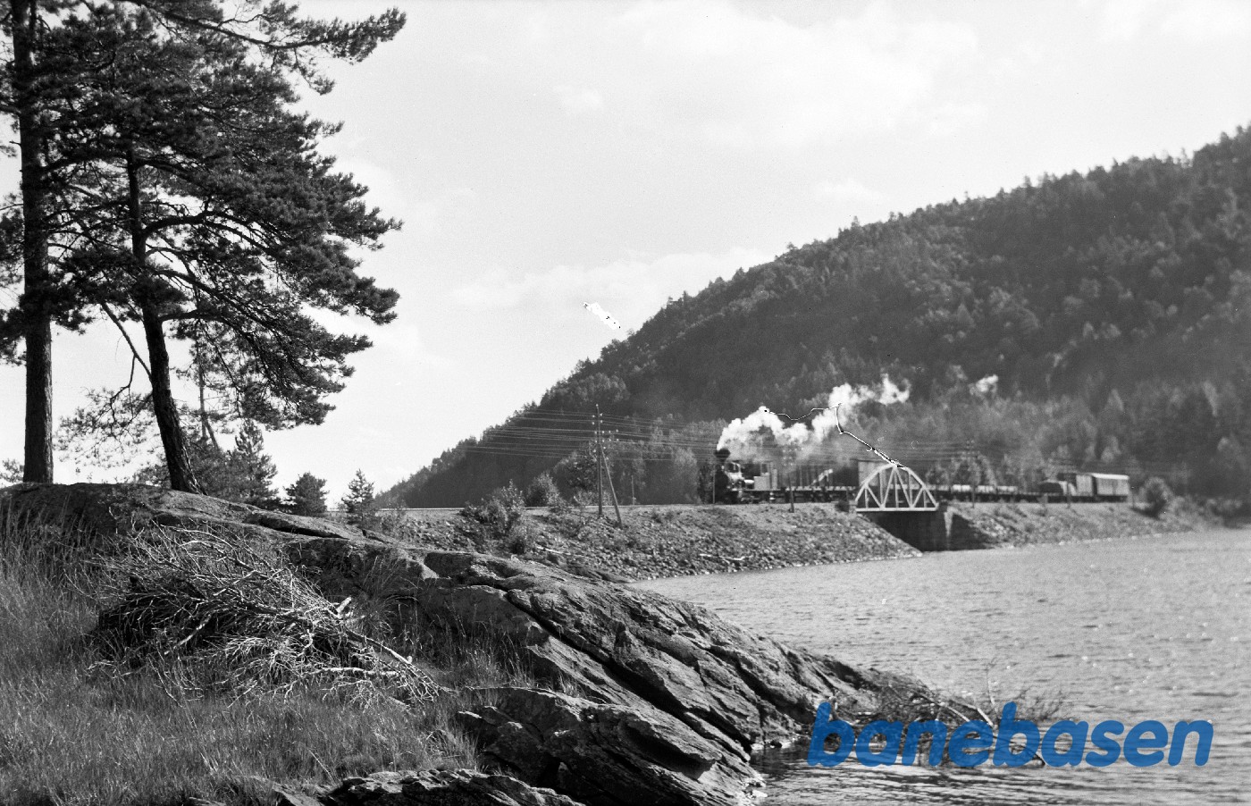 | Motiv: | Damplokomotiv med godstog på dæmningen ved Hægeland |
