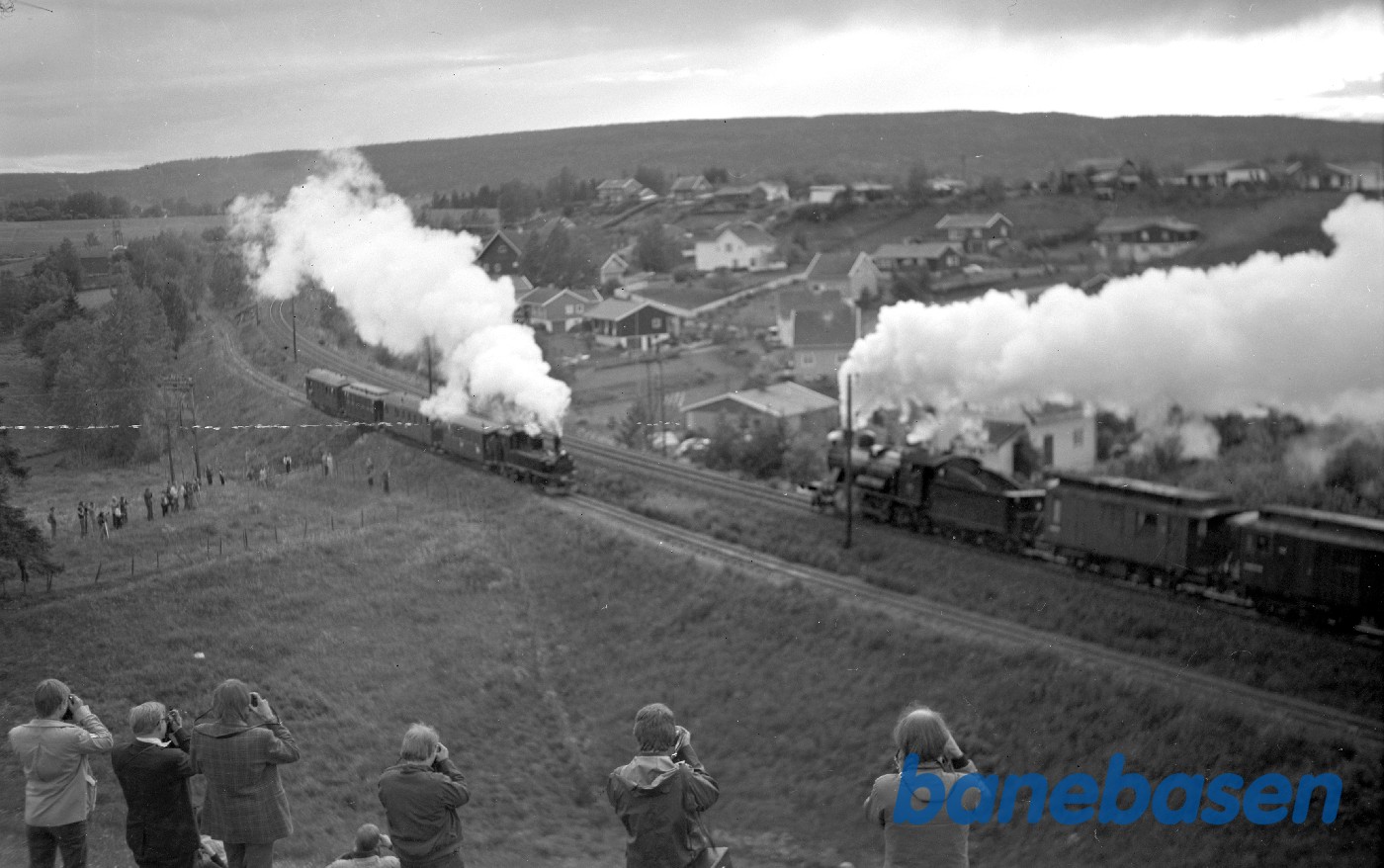 NSB damplok type 24b nr. 236 og Urskog-Aurskog - Hølanbanens Meyer-lokomotiv med tog ved Sørumsand