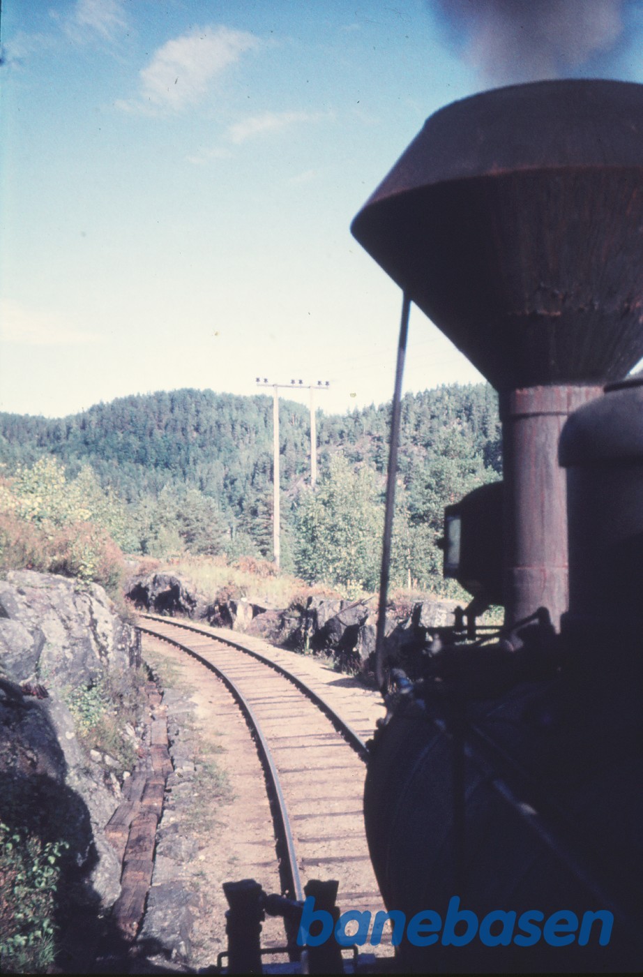 Motiv:Vue fremover fra lokomotiv nr. 2 i godstog 5661, mellem Iveland og Tveitøyna