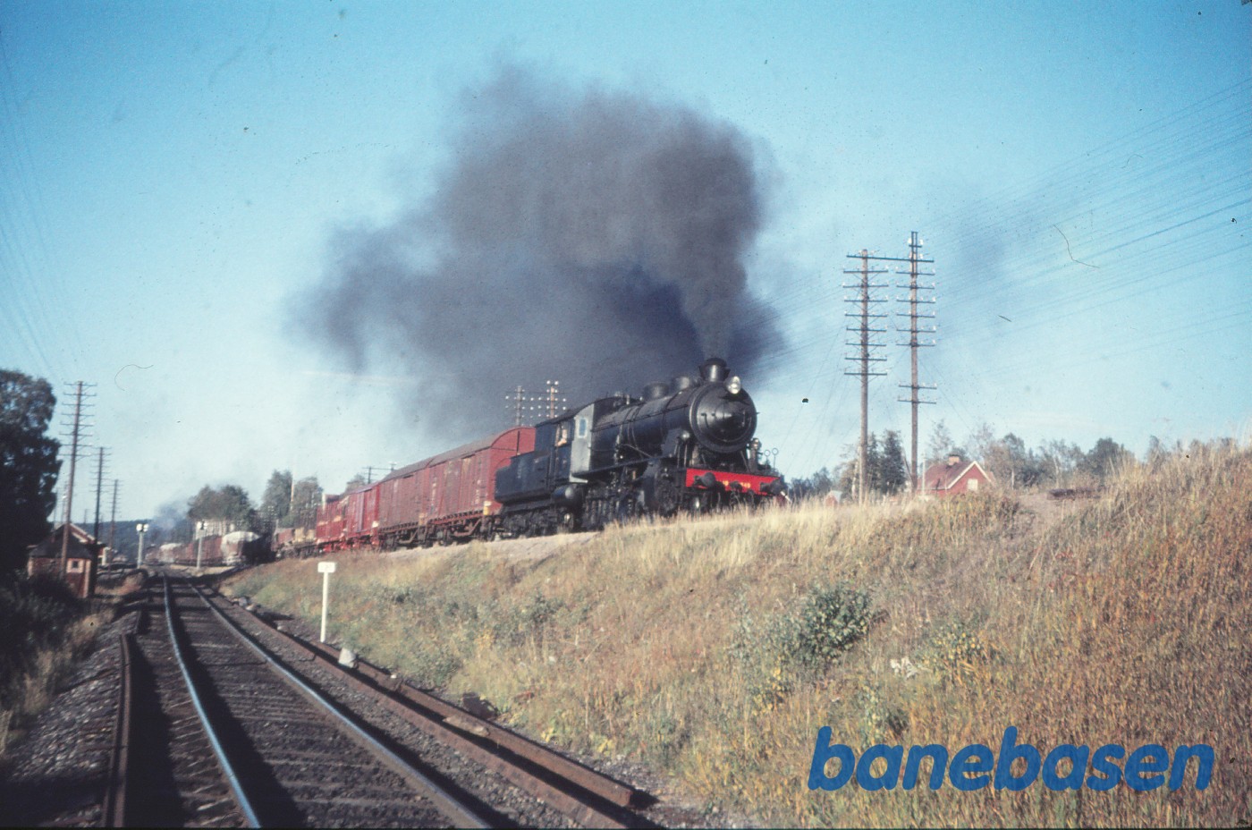 Motiv:Damplokomotiv med godstog (med skydelok) under udkørsel