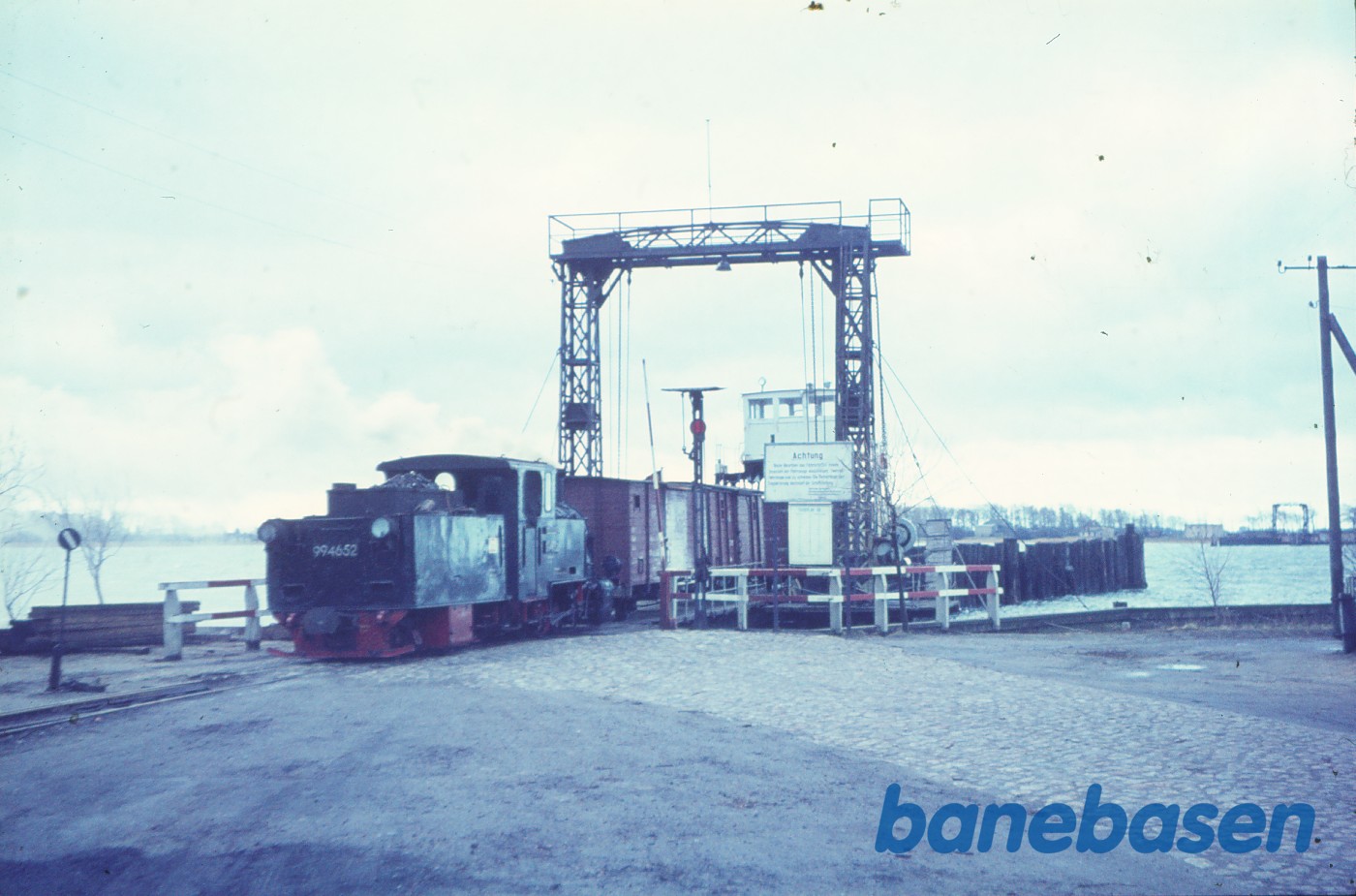 Motiv:Damplokomotiv 99 4652 rangerer med godsvogne ved færgen