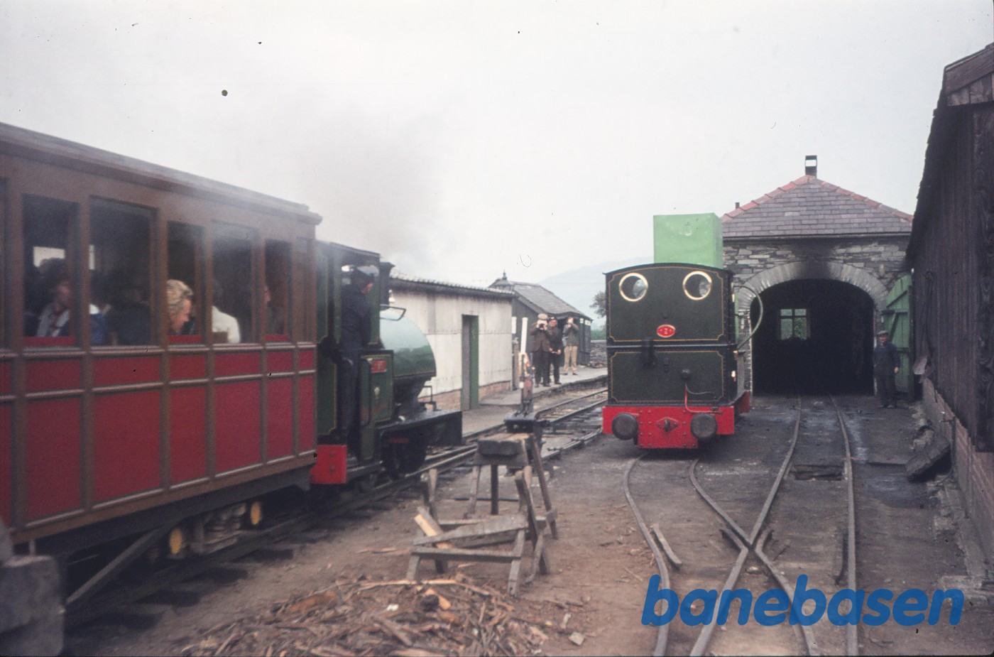Damplokomotiv nr. 3 "SIR HAYDN" med persontog og damplokomotiv nr. 2 "DOLGOCH" ved remisen