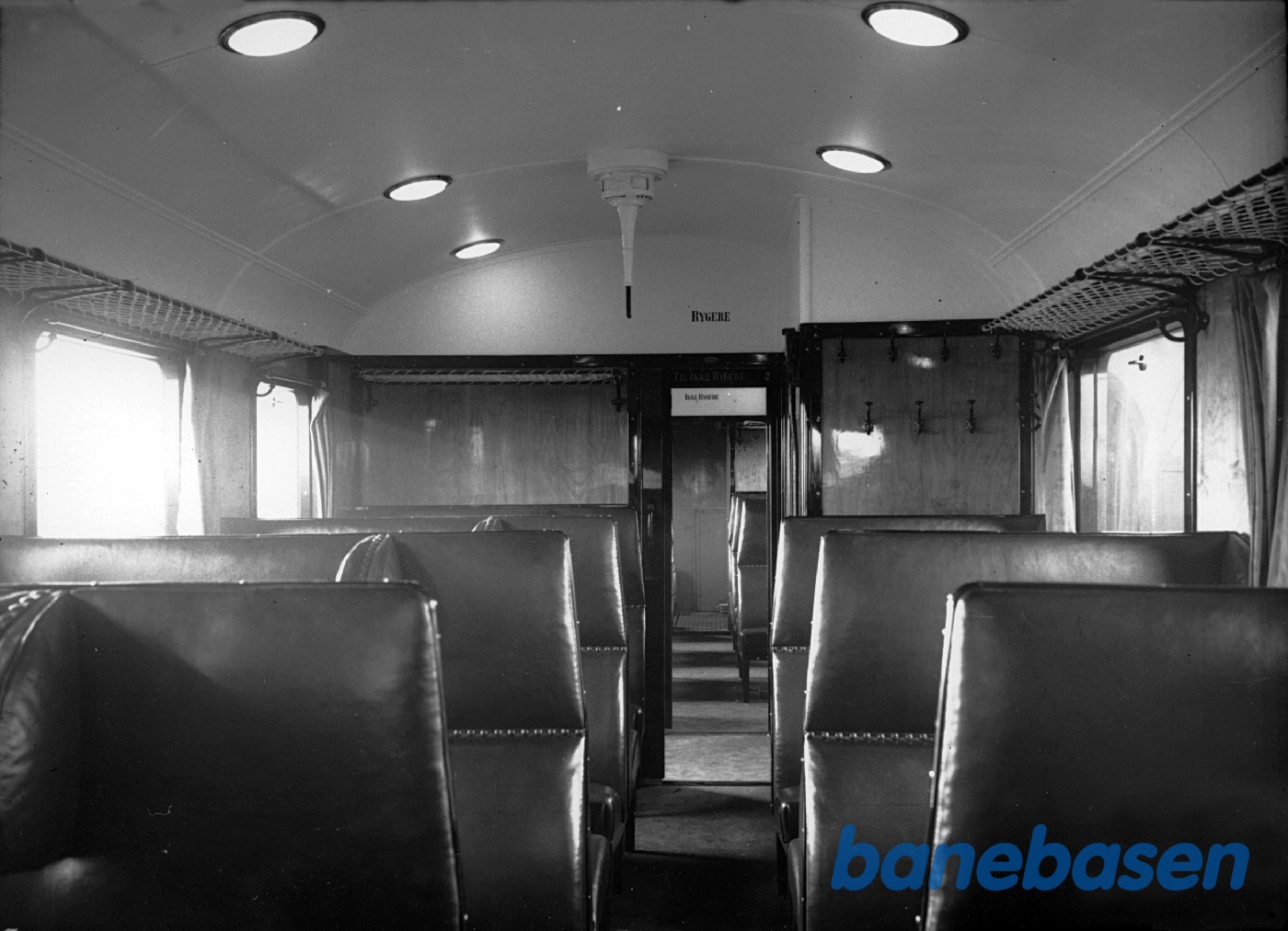 Motiv:Interiør af bagerste passagerafdeling set mod vestibule og pass.afdeling i vognmidte