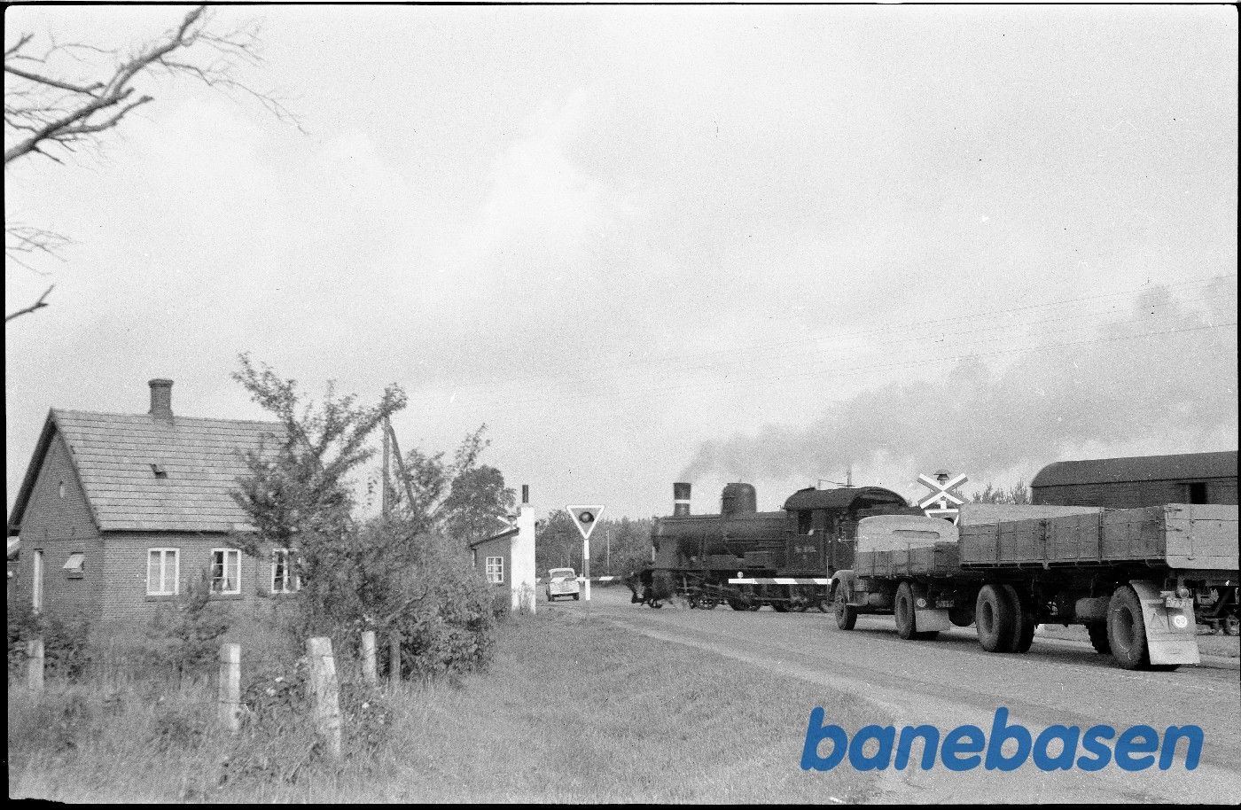 Motiv:D-maskine med tog passerer overkørsel